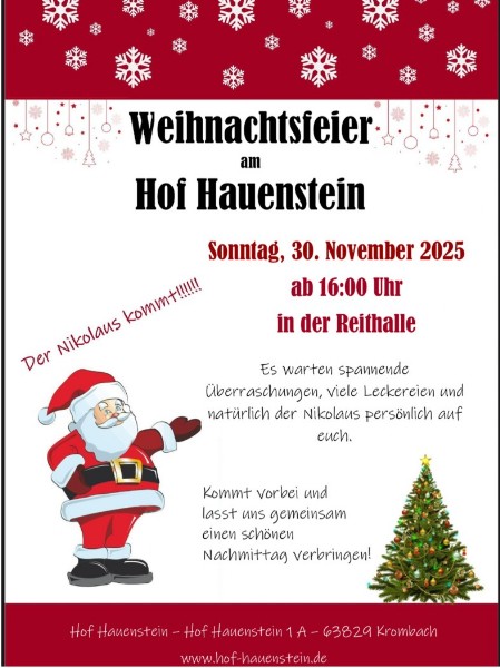 Die Pensionspferdehaltung in Boxen, Paddocks und Kleingruppen in Laufstallhaltung von Sport- und Freizeitpferde, Aufzucht- und Gnadenbrotpferden sind ein weiterer Betriebszweig. Unser Reitbetrieb, die Reitschule und der der bei uns ansässige Reitverein „Jagdclub Hofgut Hauenstein e.V.“ ist weit über die Grenzen des Kahlgrunds bekannt. Ungefähr 120 Mitglieder und unsere Reitschüler können am Hauenstein ihrem Hobby, dem Pferd frönen.